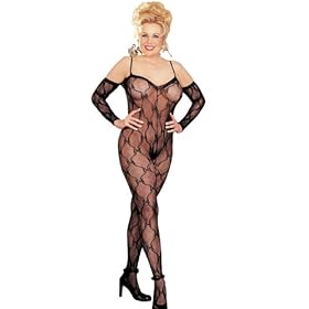 Plus size women are very sexy and this is just the garment to show yourself off. It's a beautiful stretch lace bodystocking in a bow pattern that is cut to fit plus size women up to 3X. It moves with you and hugs your curves. The back is low cut and the crotch is open. The modified gloves pictured are included. Please select your size carefully. This item is shipped to you in a sealed "hosiery type" package and cannot be returned if the package has been opened.